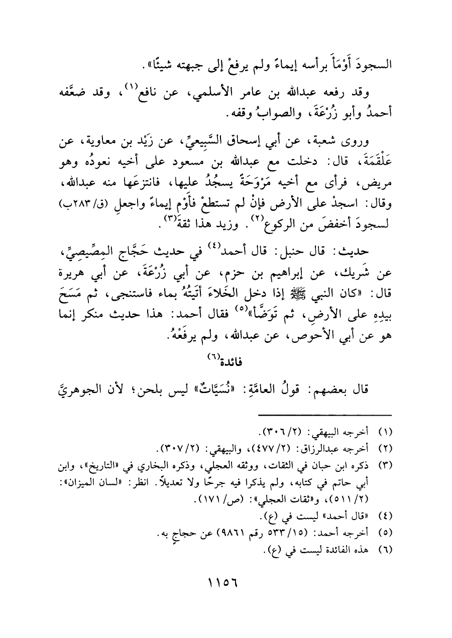 وروى شعبة، عن أبى إسحاق السَّبِيعيِّ، عن زَيْد بن معاوية، عن عَلْقَمَةَ، قال: دخلت مع عبد الله بن مسعود على أخيه نعودُه وهو مريض، فرأى مع أخيه مَرْوَحَةً يسجُدُ عليها، فانتزعَها منه عبد الله، وقال: اسجدْ على الأرض فإنْ لم تستطعْ فأَوْمِ إيماءً واجعلِ (ق/٢٨٣ ب) لسجودَ أخفضَ من الركوع (¬٢). وزيد هذا ثقة (¬٣).