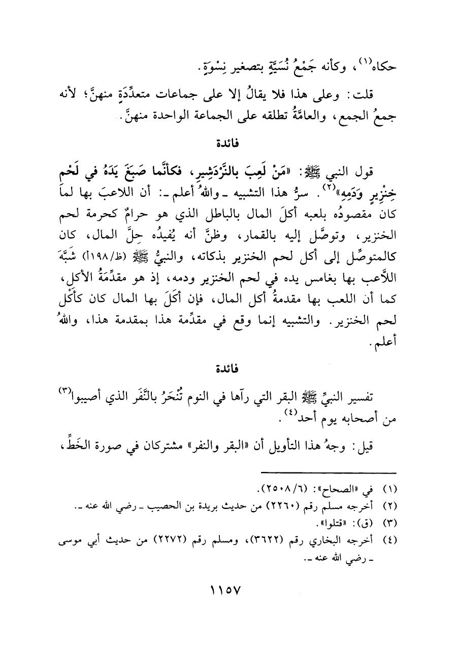 قول النبي - صلى الله عليه وسلم -: "مَنْ لَعِبَ بالنَّرْدَشِيرِ، فكأنَّما صَبَغَ يَدَهُ في لَحْمِ خِنْزِيرٍ وَدَمِهِ" (¬٢). سرُّ هذا التشبيه -والله ُكل أعلم-: أن اللاعبَ بها لما كان مقصودُه بلعبه أكلَ المال بالباطل الذي هو حرامٌ كحرمة لحم الخنزير، وتوصَّل إليه بالقمار، وظنَّ أنه يُفيدُه حِلَّ المال، كان كالمتوصِّل إلى أكل لحم الخنزير بذكاته، والنبيُّ - صلى الله عليه وسلم - (ظ/١٩٨ أ) شَبَّهَ اللَاّعب بها بغامس يده في لحم الخنزير ودمه، إذ هو مقدِّمَةُ الأكلِ، كما أن اللعب بها مقدمةُ أكل المال، فإن أكَلَ بها المال كان كأَكْل لحم الخنزير. والتشبيه إنما وقع في مقدِّمة هذا بمقدمة هذا، واللهُ أعلم.