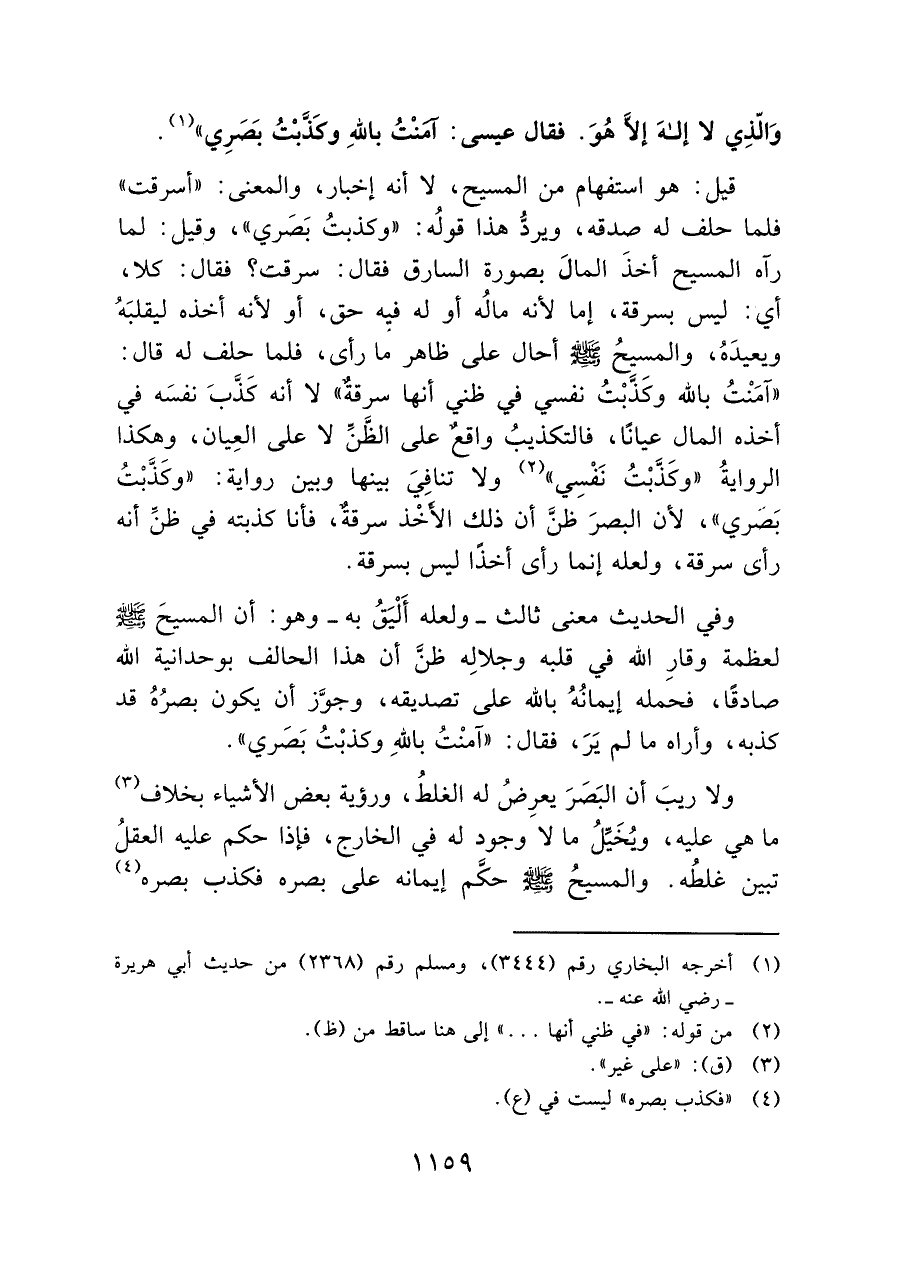 وَالّذِي لا إلهَ إلَاّ هُوَ. فقال عيسى: آمَنْتُ باللهِ وكَذَّبْتُ بَصَرِي" (¬١).