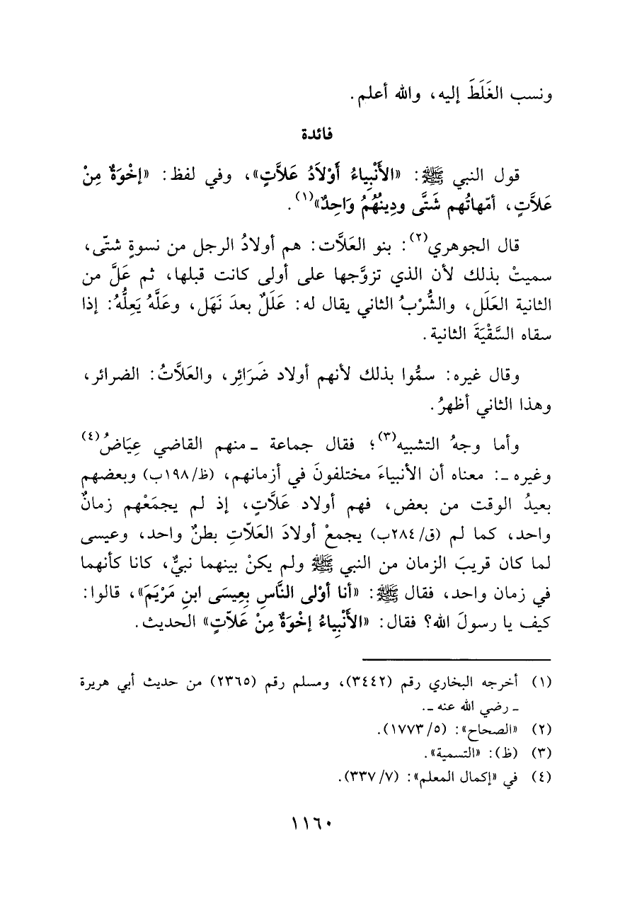قول النبي - صلى الله عليه وسلم -: "الأَنْبياءُ أَوْلادُ عَلَاّتٍ"، وفي لفظ: "إخْوَةٌ مِنْ عَلَاّتٍ، أمّهاتُهمْ شَتَّى ودِينُهُمُ وَاحِدٌ" (¬١).