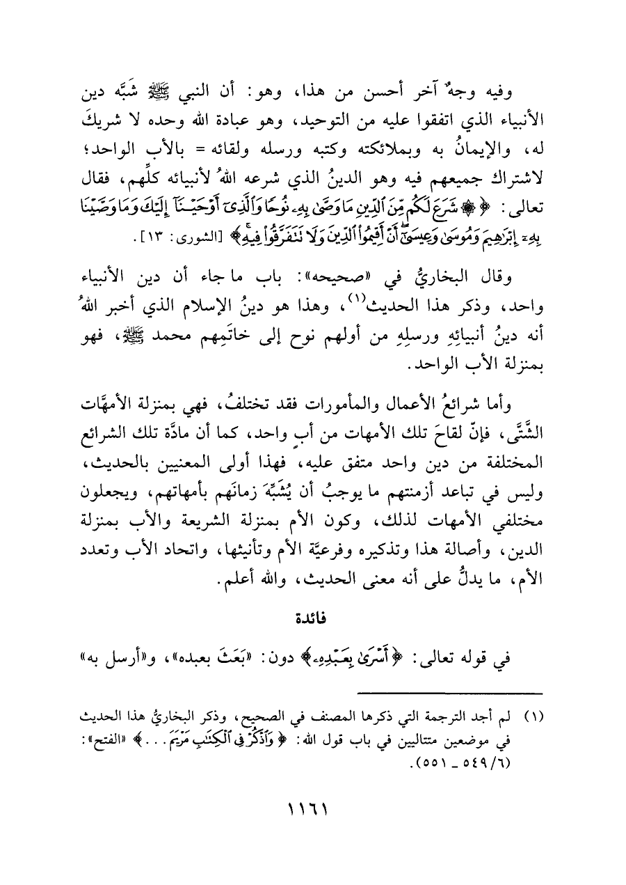 وفيه وجهٌ آخر أحسن من هذا، وهو: أن النبي - صلى الله عليه وسلم - شَبَّه دين الأنبياء الذي اتفقوا عليه من التوحيد، وهو عبادة الله وحده لا شريكَ له، والإيمانُ به وبملائكته وكتبه ورسله ولقائه = بالأب الواحد؛ لاشتراك جميعهم فيه وهو الدينُ الذي شرعه اللهُ لأنبيائه كلِّهم، فقال تعالى: {شَرَعَ لَكُمْ مِنَ الدِّينِ مَا وَصَّى بِهِ نُوحًا وَالَّذِي أَوْحَيْنَا إِلَيْكَ وَمَا وَصَّيْنَا بِهِ إِبْرَاهِيمَ وَمُوسَى وَعِيسَى أَنْ أَقِيمُوا الدِّينَ وَلَا تَتَفَرَّقُوا فِيهِ} [الشورى: ١٣].