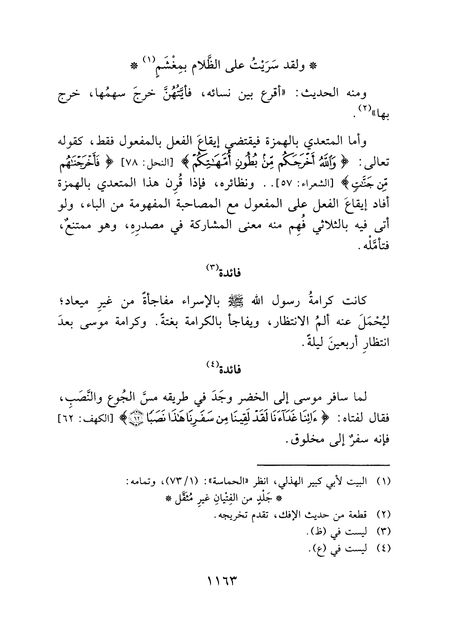 وأما المتعدي بالهمزة فيقتضى إيقاعَ الفعل بالمفعول فقط، كقوله تعالى: {وَاللَّهُ أَخْرَجَكُمْ مِنْ بُطُونِ أُمَّهَاتِكُمْ} [النحل: ٧٨] {فَأَخْرَجْنَاهُمْ مِنْ جَنَّاتٍ} [الشعراء: ٥٧] .. ونظائره، فإذا قُرِن هذا المتعدي بالهمزة أفاد إيقاعَ الفعل على المفعول مع المصاحبة المفهومة من الباء، ولو أتى فيه بالثلاثى فُهِم منه معنى المشاركة في مصدرِهِ، وهو ممتنعٌ، فتأمَّلْه.