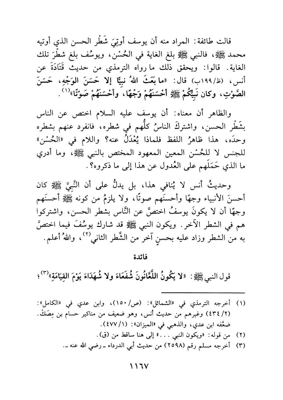 وحديث أنس لا يُنافي هذا، بل يدلُّ على أن النَّبِيَّ - صلى الله عليه وسلم - كان أحسنَ الأنبياء وجهًا وأحسنَهم صوتًا، ولا يلزمُ من كونه - صلى الله عليه وسلم - أحسنَهم وجهًا أن لا يكونَ يوسفُ اختصَّ عن النَّاس بشطر الحسن، واشتركوا هم في الشطر الآخر. ويكون النبي - صلى الله عليه وسلم - قد شارك يوسُفَ فيما اختصَّ به من الشطر وزاد عليه بحسنٍ آخر من الشَّطر الثاني (¬٢)، واللهُ أعلم.