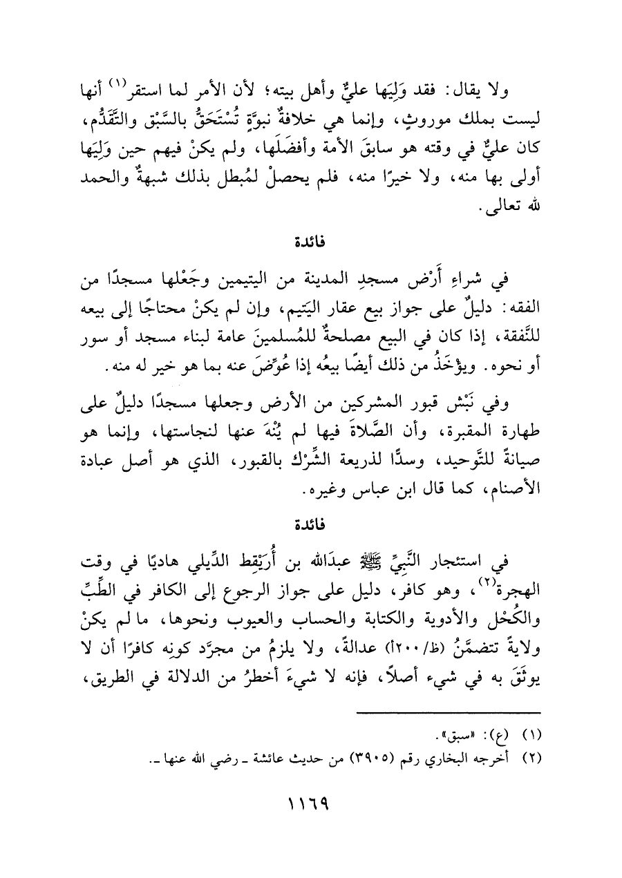 في استئجار النَّبِيِّ - صلى الله عليه وسلم - عبدَ الله بن أُرَيْقِط الدِّيلي هاديًا في وقت الهجرة (¬٢)، وهو كافر، دليل على جواز الرجوع إلى الكافر في الطِّبِّ والكُحْل والأدوية والكتابة والحساب والعيوب ونحوها، ما لم يكنْ ولايةً تتضمَّنُ (ظ/ ٢٠٠ أ) عدالةً، ولا يلزمُ من مجرَّد كونِه كافرًا أن لا يوثَقَ به في شيء أصلاً، فإنه لا شيءَ أخطرُ من الدلالة في الطريق،