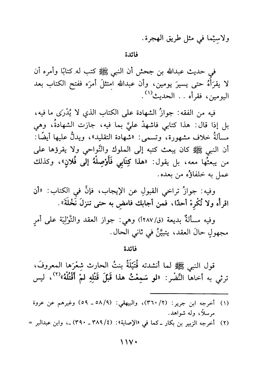 في حديث عبد الله بن جحش أن النبي - صلى الله عليه وسلم - كتب له كتابًا وأمره أن لا يقرَأهُ حتى يسيرَ يومين، وأن عبد الله امتثلَ أمرَه ففتح الكتاب بعد اليومين، فقرأه .. الحديث (¬١).