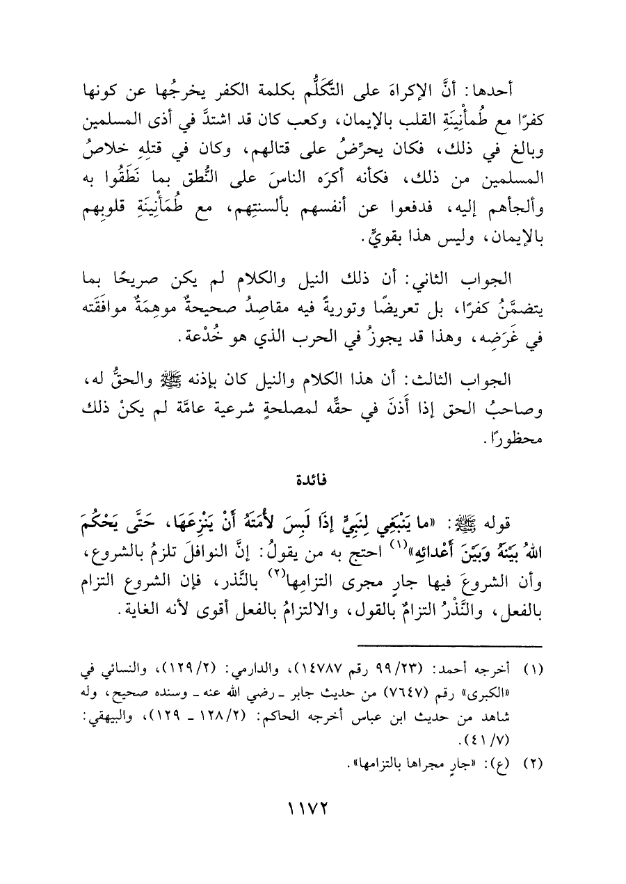 قوله - صلى الله عليه وسلم -: "ما يَنْبَغِي لِنبِيٍّ إذَا لَبسَ لأُمَتَهُ أَنْ يَنْزِعَهَا، حَتَّى يَحْكُمَ الله بَيْنَه وَبَينَ أَعْدائهِ" (¬١) احتج من يقولُ: إنَّ النوافلَ تلزمُ بالشروع، وأن الشروعَ فيها جار مجرى التزامِها (¬٢) بالنَّذر، فإن الشروع التزام بالفعل، والنَّذْر التزامٌ بالقول، والالتزامُ بالفعل أقوى لأنه الغاية.