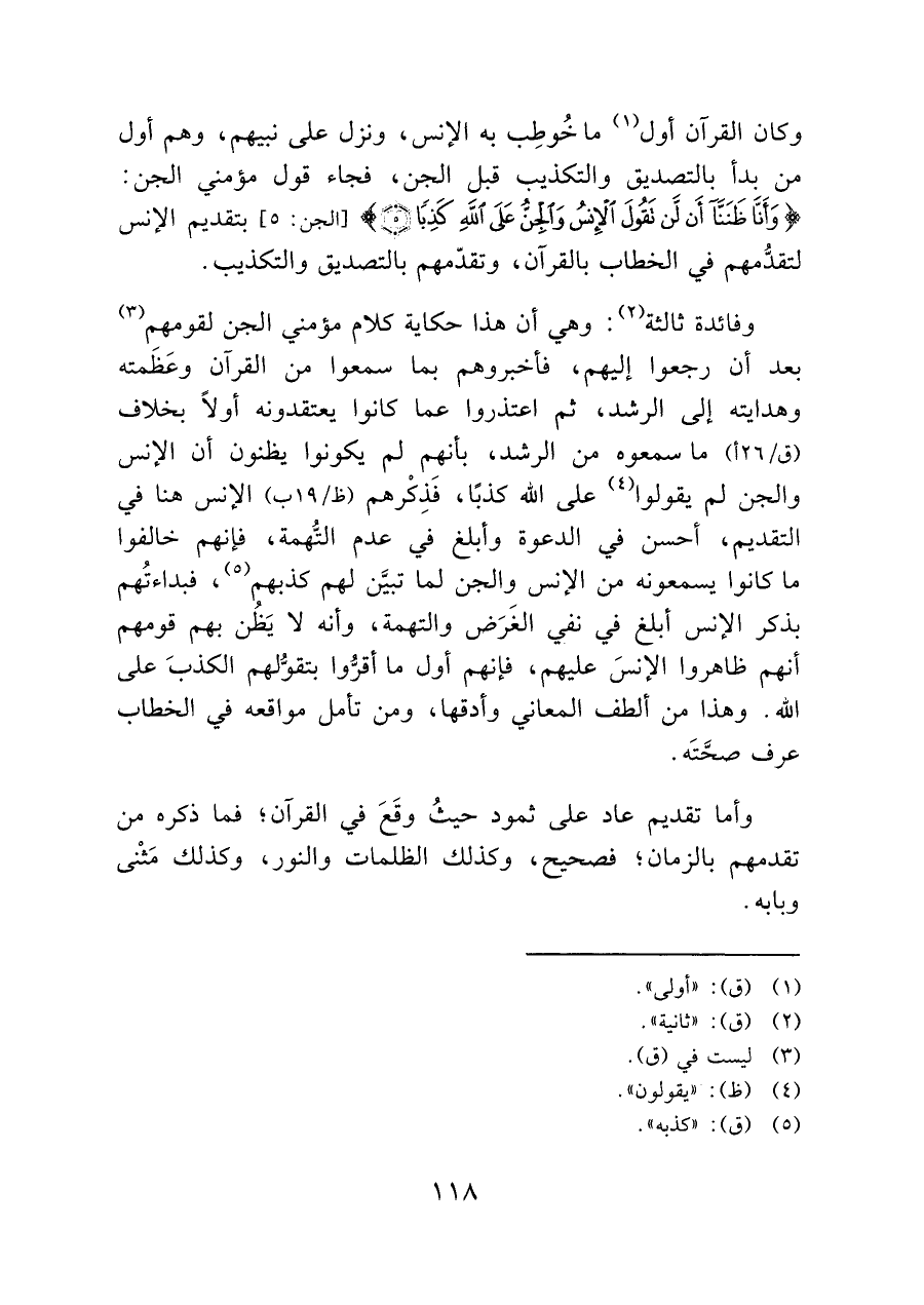 وكان القرآن أول (¬١) ما خُوطِب به الإنس، ونزل على نبيهم، وهم أول من بدأ بالتصديق والتكذيب قبل الجن، فجاء قول مؤمني الجن: {وَأَنَّا ظَنَنَّا أَنْ لَنْ تَقُولَ الْإِنْسُ وَالْجِنُّ عَلَى اللَّهِ كَذِبًا} [الجن: ٥] بتقديم الإنس لتقدُّمهم في الخطاب بالقرآن، وتقدّمهم بالتصديق والتكذيب.