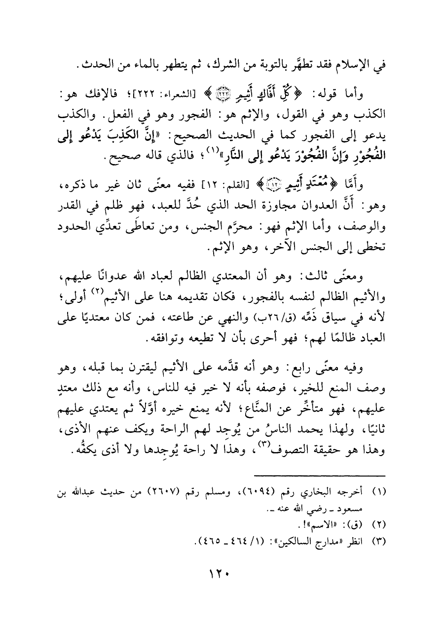 وفيه معنىً رابع: وهو أنَّه قدَّمه على الأثيم ليقترن بما قبله، وهو وصف المنع للخير، فوصفه بأنه لا خير فيه للناس، وأنه مع ذلك معتدٍ عليهم، فهو متأخِّر عن المنَّاع؛ لأنه يمنع خيره أوَّلاً ثمَّ يعتدي عليهم ثانياً، ولهذا يحمد الناسُ من يُوجِد لهم الراحة ويكف عنهم الأذى، وهذا هو حقيقة التصوف (¬٣)، وهذا لا راحة يُوجِدها ولا أذى يكفُّه.