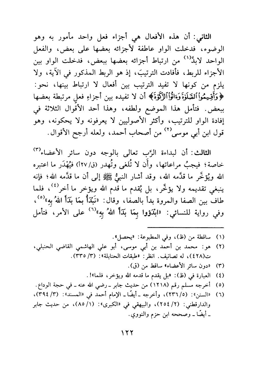 الثالث: أن لبداءة الرَّب تعالى بالوجه دون سائر الأعضاء (¬٣) خاصة؛ فيجبُ مراعاتها، وأَن لا تُلغى وتُهدر (ق/ ٢٧ أ) فيُهْدَر ما اعتبره الله ويُؤخَّر ما قدَّمه الله، وقد أشار النبيُّ - صلى الله عليه وسلم - إلى أن ما قدَّمه الله؛ فإنَّه ينبغي تقديمه ولا يؤخَّر، بل يُقدم ما قدم الله ويؤخر ما أخر (¬٤)، فلما طاف بين الصفا والمروة بدأ بالصفا، وقال: "نَبْدَأُ بمَا بَدَأَ اللهُ بِهِ" (¬٥)، وفي رواية للنسائي: "ابْدَؤوا بِمَا بَدَأَ اللهُ بِهِ" (¬٦) على الأمر، فتأمل