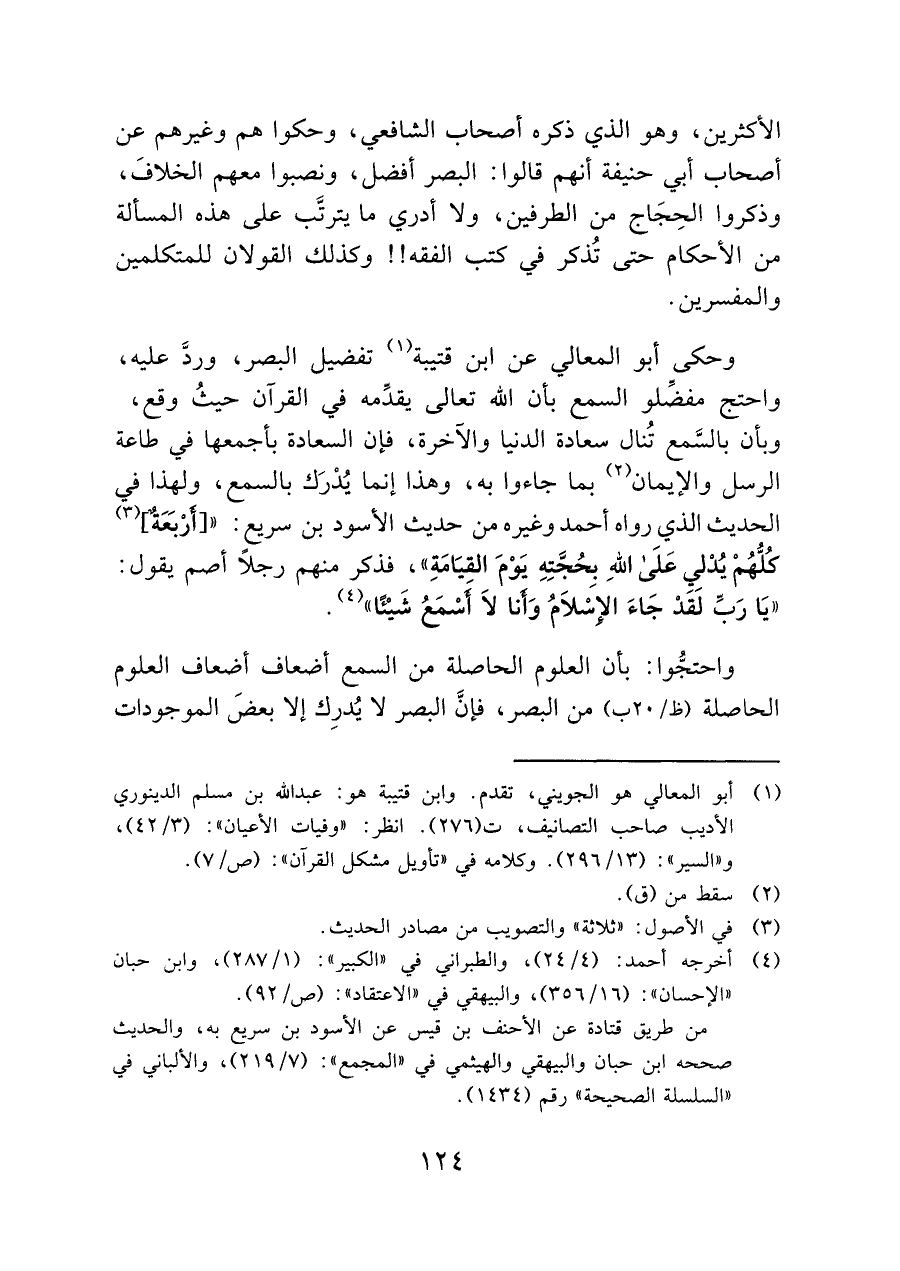 الأكثرين، وهو الذي ذكره أصحاب الشافعي، وحكوا هم وغيرهم عن أصحاب أبي حنيفة أنهم قالوا: البصر أفضل، ونصبوا معهم الخلافَ، وذكروا الحِجَاج من الطرفين، ولا أدري ما يترتَّب على هذه المسألة من الأحكام حتى تُذكر في كتب الفقه!! وكذلك القولان للمتكلمين والمفسرين.