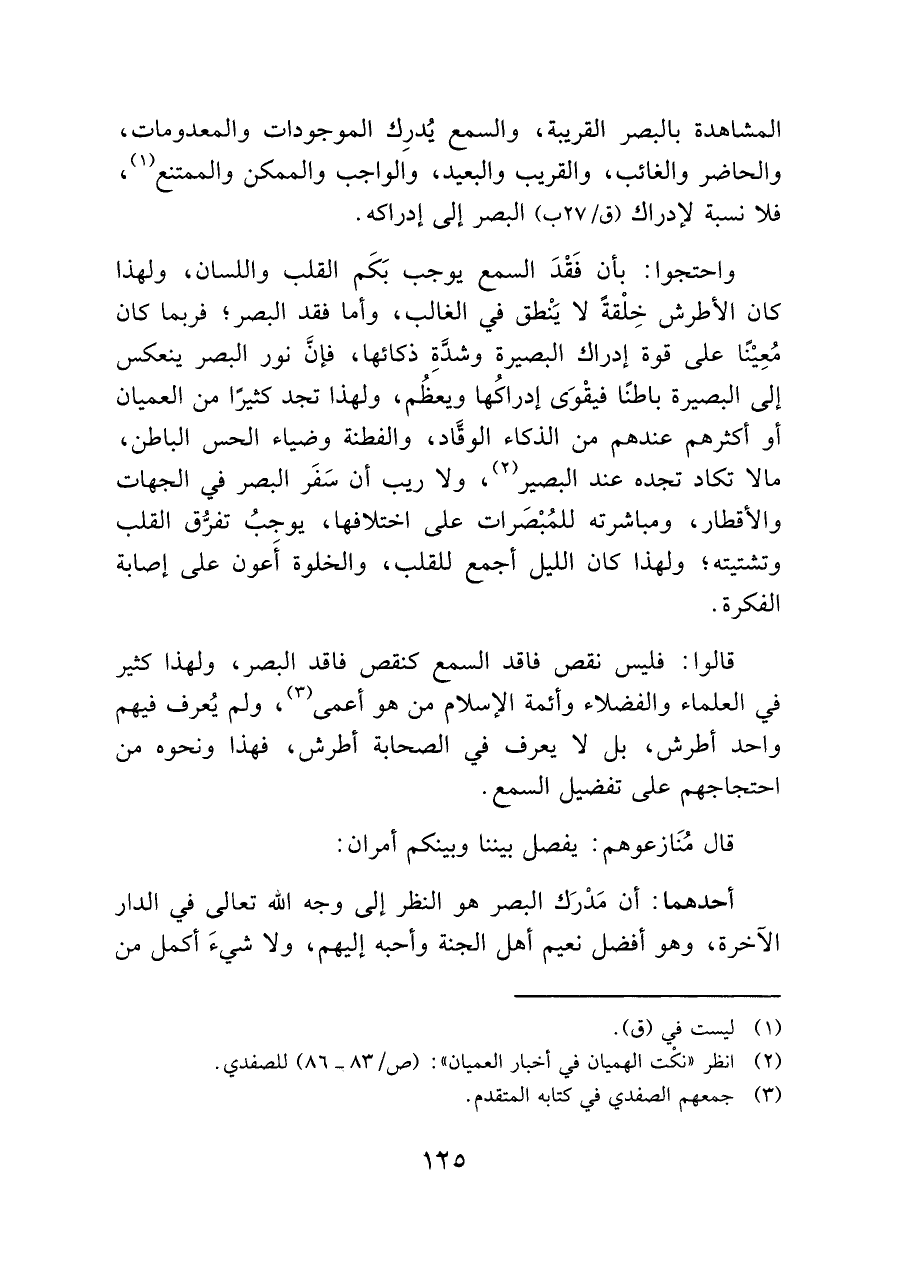 المشاهدة بالبصر القريبة، والسمع يُدرِك الموجودات والمعدومات، والحاضر والغائب، والقريب والبعيد، والواجب والممكن والممتنع (¬١)، فلا نسبة لإدراك (ق/ ٢٧ ب) البصر إلى إدراكه.