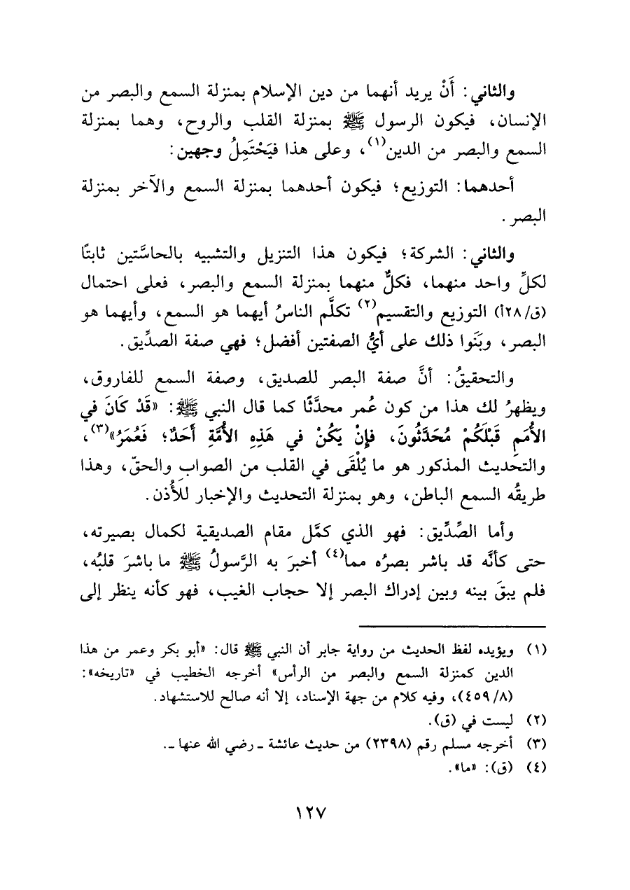 والثاني: الشركة؛ فيكون هذا التنزيل والتشبيه بالحاسَّتين ثابتاً لكلِّ واحد منهما، فكلٌّ منهما بمنزلة السمع والبصر، فعلى احتمال (ق/ ٢٨ أ) التوزيع والتقسيم (¬٢) تكلَّم الناسُ أيهما هو السمع، وأيهما هو البصر، وبَنَوا ذلك على أيُّ الصفتين أفضل؛ فهي صفة الصدِّيق.