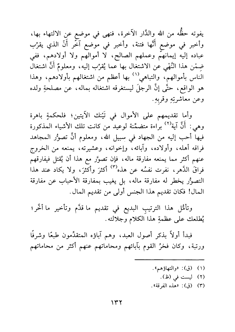 وأما تقديمهم على الأموال في تَيْنك الآيتين؛ فلحكمةٍ باهرة وهي: أَنَّ آية (¬٢) براءة متضمِّنة لوعيد من كانت تلك الأشياء المذكورة فيها أحب إليه من الجهاد في سبيل الله، ومعلوم أنَّ تصوُّر المجاهد فراقه أهله، وأولاده، وآبائه، وإخوانه، وعشيرته، يمنعه من الخروج عنهم أكثر مما يمنعه مفارقة ماله، فإن تصوَّر مع هذا أن يُقتل فيفارقهم فراقَ الدَّهر، نفرت نفسُه عن هذه (¬٣) أكثرَ وأكثرَ، ولا يكاد عند هذا التصوُّر يخطر له مفارقة ماله، بل يغيب بمفارقة الأحباب عن مفارقة المال! فكان تقديم هذا الجنس أولى من تقديم المال.