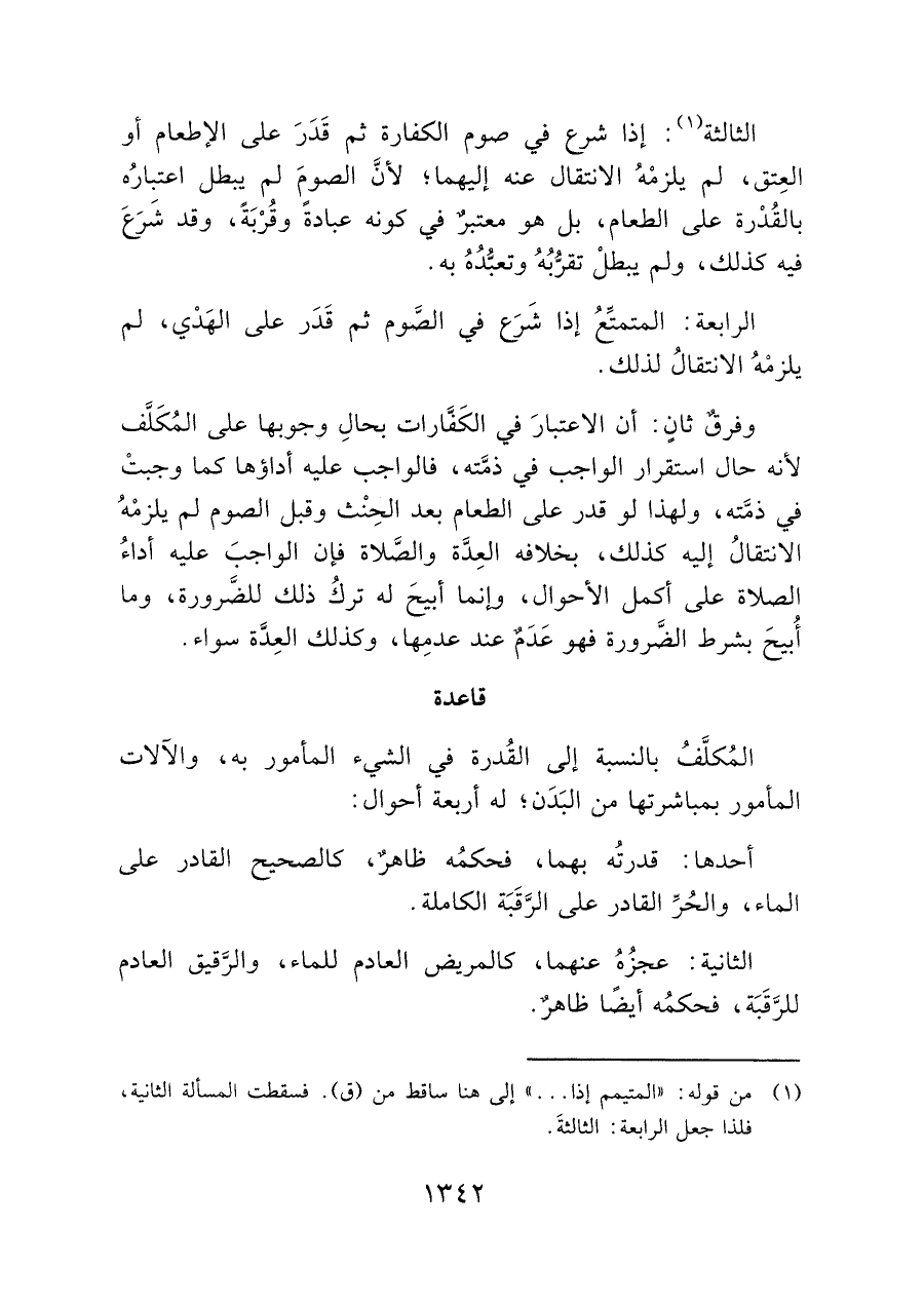 وفرقٌ ثانٍ: أن الاعتبار في الكَفَّارات بحالِ وجوبها على المُكَلَّف لأنَّه حال استقرار الواجب في ذمَّته، فالواجب عليه أداؤها كما وجبت في ذمَّته، ولهذا لو قدر على الطَّعام بعد الحِنث وقل الصوم لم يلزمْهُ الانتقالُ إليه كذلك، بخلافه العِدَّة والصَّلاة فإن الواجبَ عليه أداءُ الصَّلاة على أكمل الأحوال، وإنما أبيحَ له تركُ ذلك للضَّرورة، وما: أُبيحَ بشرط الضَّرورة فهو عَدَمٌ عند عدمِها، وكذلك العِدَّة سواء.