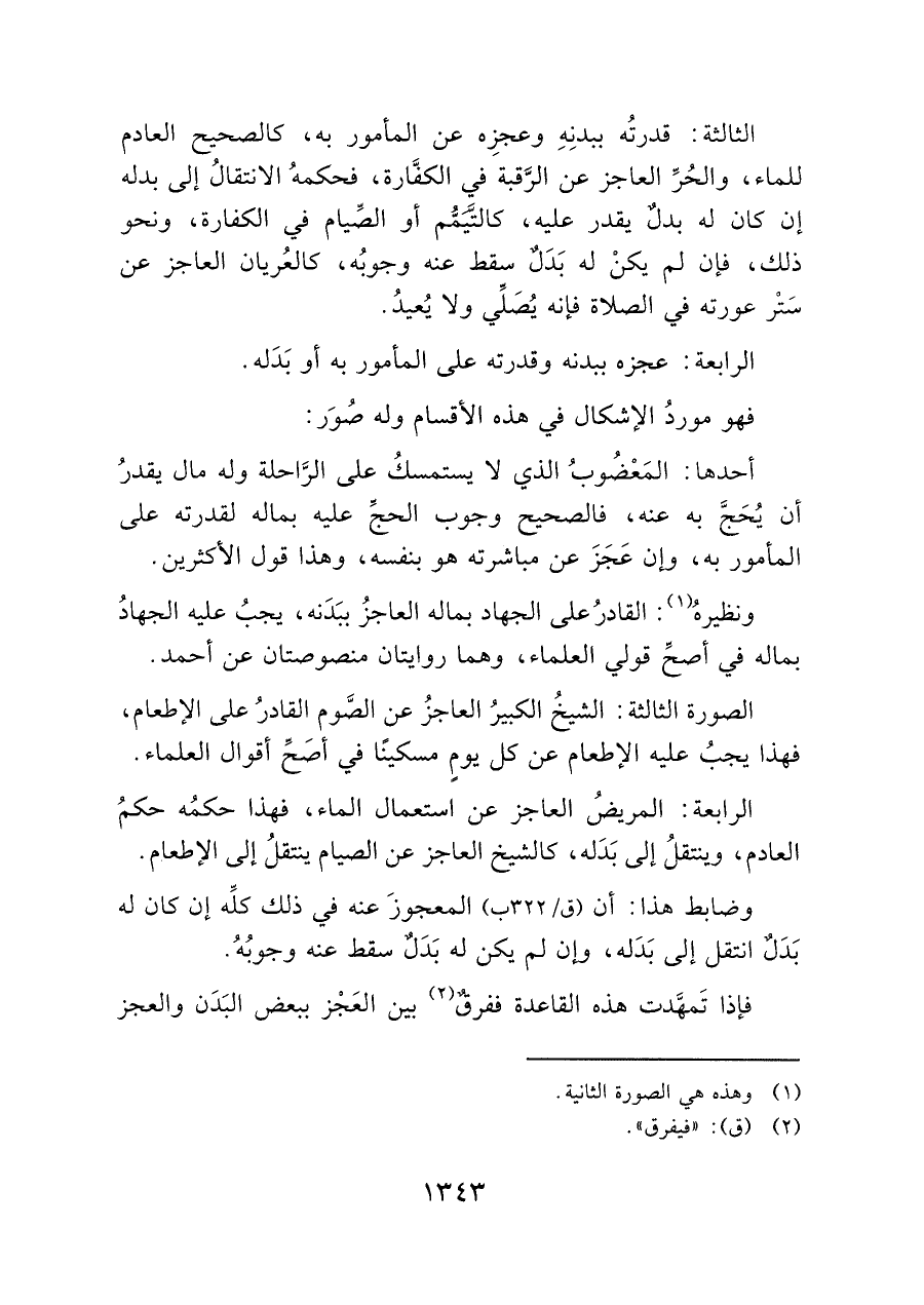 الثَّالثة: قدرتُه ببدنِهِ وعجزه عن المأمور به، كالصحيح العادم للماء، والحُرِّ العاجز عن الرَّقبة في الكفَّارة، فحكمهُ الانتقالُ إلى بدله إن كان له بدلٌ يقدر عليه، كالتَّيَمُّم أو الصِّيام في الكفارة، ونحو ذلك، فإن لم يكنْ له بَدَلٌ سقط عنه وجوبُه، كالعُريان العاجز عن سَتر عورته في الصَّلاة فإنَّه يُصَلِّي ولا يُعيدُ.