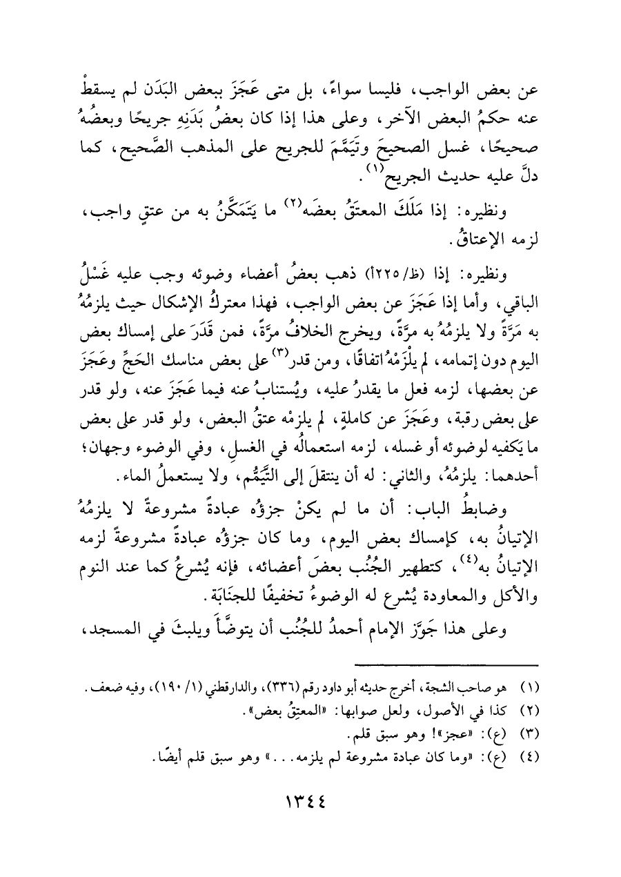 ونظيره: إذا (ظ / ٢٢٥ أ) ذهب بعض أعضاء وضوئه وجب عليه غسْلُ الباقي، وأمَّا إذا عَجَزَ عن بعض الواجب، فهذا معتركُ الإشكال حيث يلزمهُ به مَرَّةً ولا يلزمه به مرَّة، ويخرج الخلافُ مرَّة، فمن قَدَرَ على إمساك بعض اليوم دون إتمامه؛ أيلْزَمْهُ اتفاقًا، ومن قدر (¬٣) على بعض مناسك الحَجَّ وعجَزَ عن بعضها، لزمه فعل ما يقدرُ عليه، ويُستنابُ عنه فيما عَجَزَ عنه، ولو: قدر على بعض رقبة، وعَجَزَ عن كاملةٍ؛ أيلزمْه عتقُ البعض، ولو قدر على بعض ما يَكفيه لوضوئه أو غسله، لزمه استعمالُه في الغسلِ، وفي الوضوء وجهاد؛ أحدهما: يلزمُهُ، والثَّاني: له أن ينتقلَ إلى التَّيمُّم، ولا يستعمل الماء.