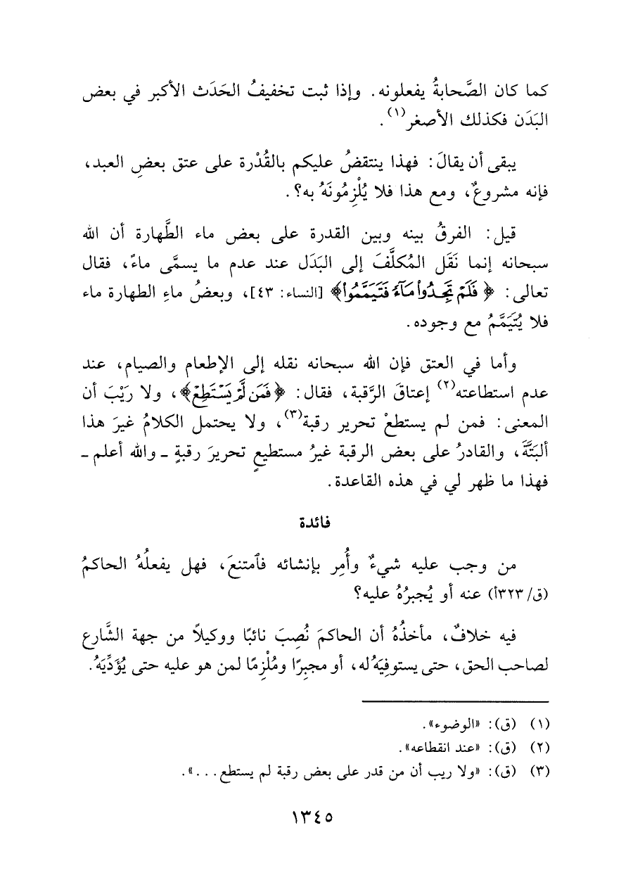 وأمَّا في العتق فإن الله سبحانه نقله إلى الإطعام والصيام، عند عدم استطاعته (¬٢) إعتاقَ الرَّقبة، فقال: {فَمَنْ لَمْ يَسْتَطِعْ}، ولا رَيْبَ أن المعنى: فمن لم يستطعْ تحرير رقبة (¬٣)، ولا يحتمل الكلامُ غيرَ هذا ألبَتَّةَ، والقادرُ على بعض الرقبة غير مستطيع تحريرَ رقبة -والله أعلم- فهذا ما ظهر لي في هذه القاعدة.