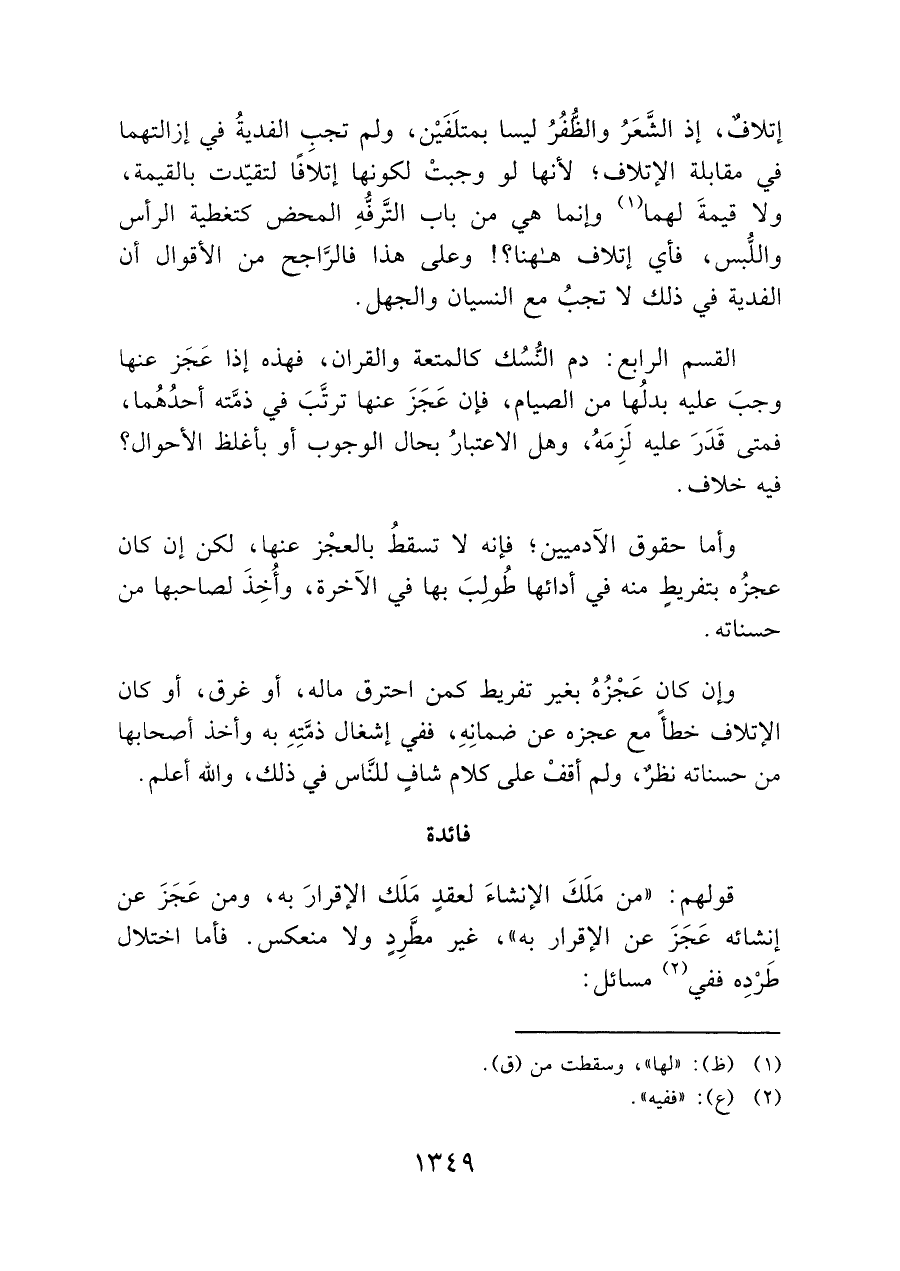 وإن كان عَجْزهُ بغير تفريط كمن احترق ماله، أو غرق، أو كان الإتلاف خطأ مع عجزه عن ضمانِهِ، ففي إشغال ذمَّتِهِ به وأخذ أصحابها من حسناته نظرٌ، ولم أقفْ على كلام شافٍ للنَّاس في ذلك، والله أعلم.