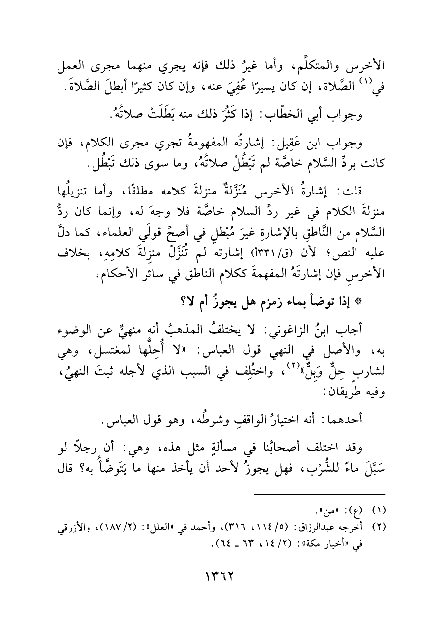 قلت: إشارةُ الأخرس مُنَزَّلة منزلةَ كلامه مطلقًا، وأمَّا تنزيلها منزلةَ الكلام في غير ردِّ السَّلام خاصة فلا وجهَ له، وإنَّما كان ردُّ السَّلام من النَّاطقِ بالإشارةِ غيرَ مُبْطل في أصحِّ قولي العلماء، كما دلَّ عليه النص؛ لأنَّ إشارته لم تُنزَّل منزِلةَ كلامِهِ، بخلاف الأخرسِ فإن إشارتَهُ المفهمةَ ككلام الناطق في سائر الأحكام.