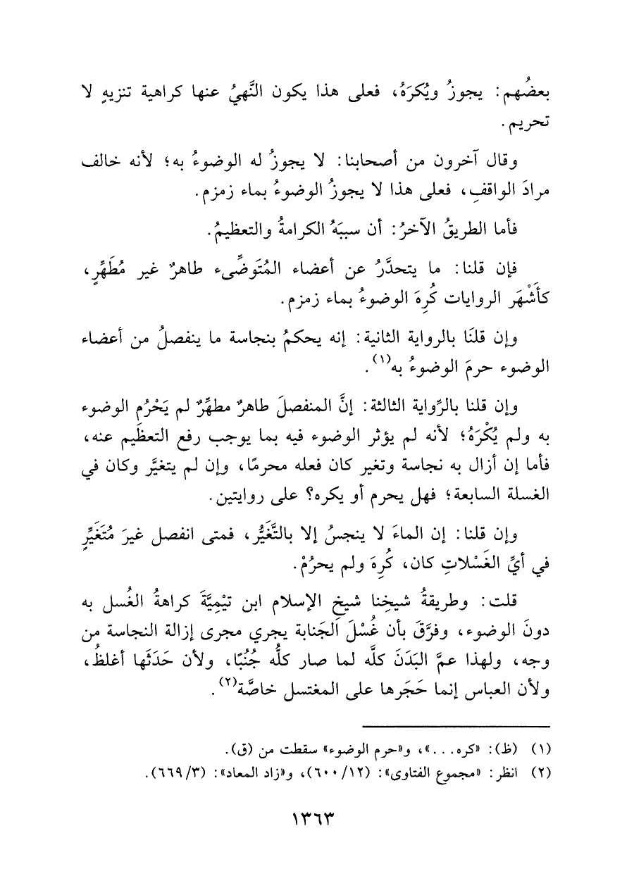 فإن قلنا: ما يتحدَّرُ من أعضاء المُتَوضِّئ طاهرٌ غير مُطَهِّر، كأَشْهَر الرِّوايات كُرِهَ الوضوءُ بماء زمزم.