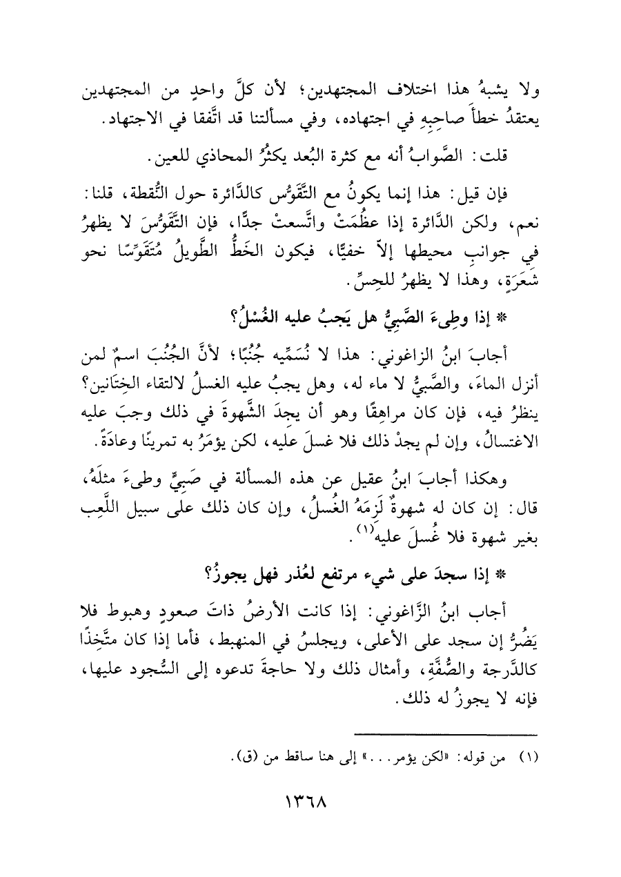 فإن قيل: هذا إنَّما يكون مع التَّقوُّس كالدَّائرة حول النُّقطة، قلنا: تعم، ولكن الدَّائرة إذا عظُمتْ واتَّسعتْ جدًّا، فإن التَّقَوُّسَ لا يظهرُ في جوانب محيطها إلّا خفيًّا، فيكون الخَطُّ الطَّويلُ مُتَقَوسًا نحو شَعَرَةٍ، وهَذا لا يظهرُ للحِسِّ.