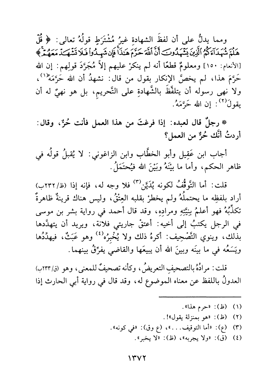 قلت: مرادُهُ بالتَّصحيفِ التعريض، وكأنه تصحيفٌ للمعنى، وهو العدول باللفظ عن معناه الموضوع له، وقد قال في رواية أبي الحارث إذا