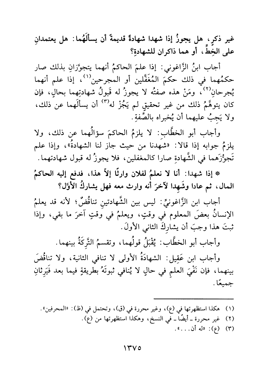 أجاب ابن الزَّاغونيِّ: ليس بين الشَّهادتينِ تناقُضٌ؛ لأنه قد يعلمُ الإنسانُ بعضَ المعلوم في وقتِ، ويعلمُ في وقتٍ آخرَ ما بقي، وإذا ثبتَ هذا وجبَ أنَّ يشارِكَ الثَّاني الأولَ.