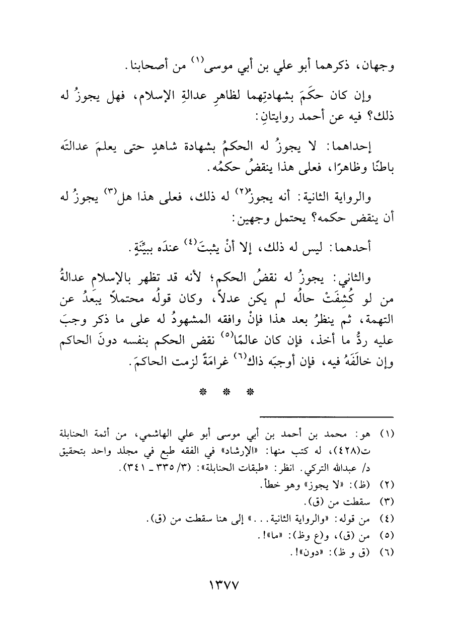 (¬١) هو: محمَّد بن أحمد بن أبي موسى أبو علي الهاشمي، من أئمة الحنابلة ت (٤٢٨)، له كتب منها: "الإرشاد" في الفقه طبع في مجلد واحد بتحقيق د/ عبد الله التركي. انظر: "طبقات الحنابلة": (٣/ ٣٣٥ - ٣٤١).