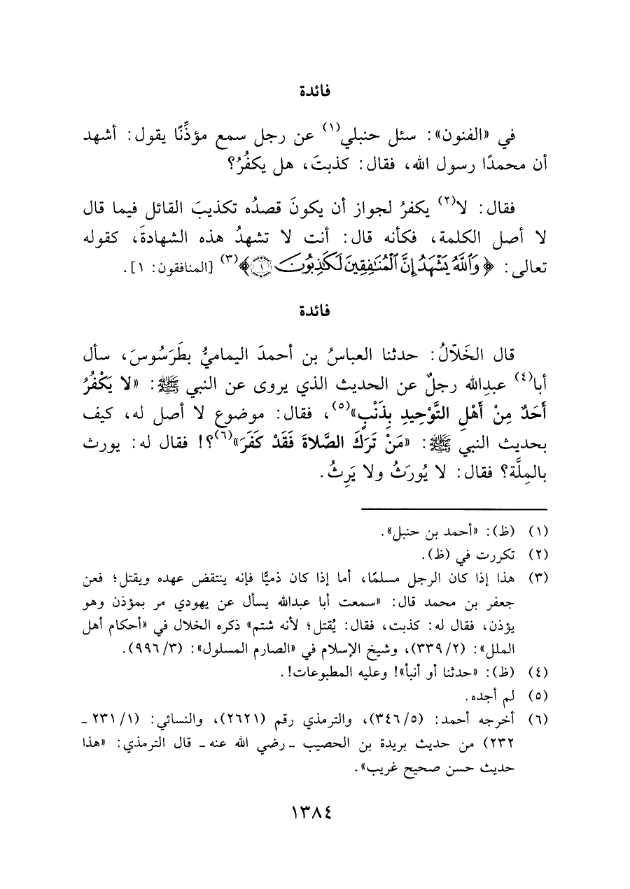 (¬٣) هذا إذا كان الرجل مسلمًا، أما إذا كان ذميًّا فإنه ينتقض عهده ويقتل؛ فعن جعفر بن محمد قال: "سمعت أبا عبد الله يسأل عن يهودي مر بمؤذن وهو يؤذن، فقال له: كذبت، فقال: يُقتل؛ لأنه شتم" ذكره الخلال في "أحكام أهل الملل": (٢/ ٣٣٩) وشيخ الإسلام في "الصارم المسلول": (٣/ ٩٩٦).