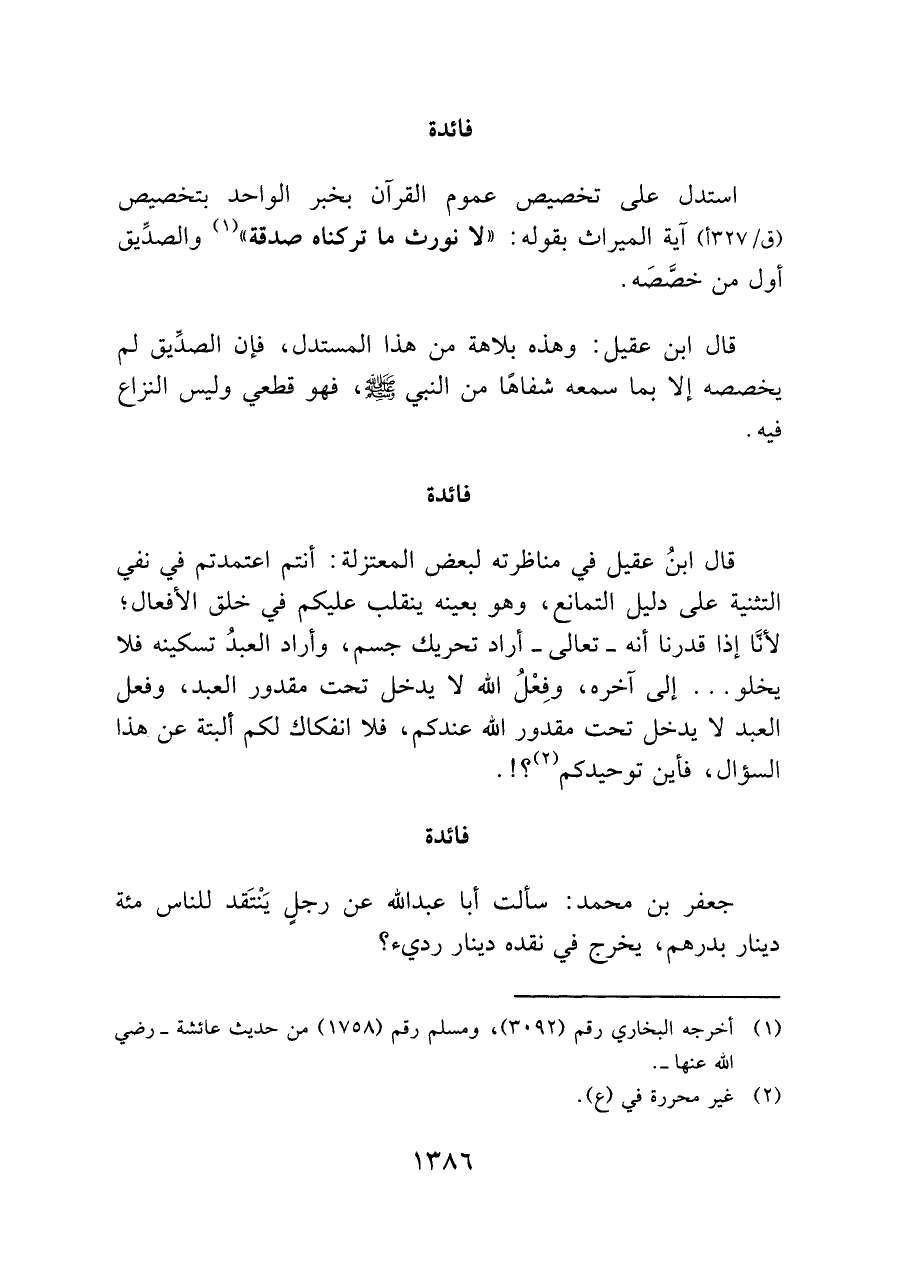 قال ابن عقيل: وهذه بلاهة من هذا المستدل، فإن الصدِّيق لم يخصصه إلا بما سمعه شفاهًا من النبي - صلى الله عليه وسلم -، فهو قطعي وليس النزاع فيه.