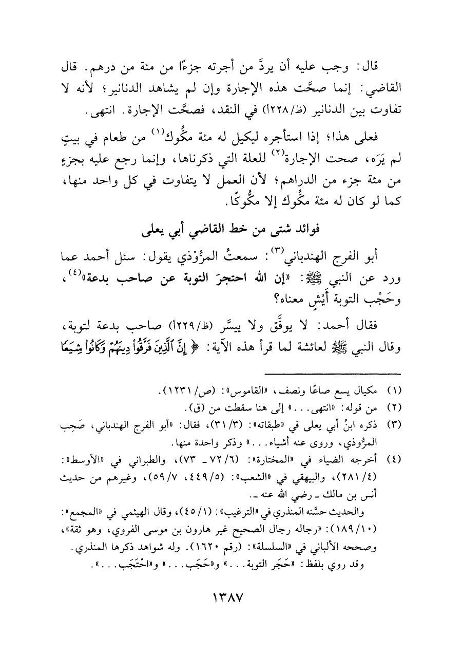قال: وجب عليه أن يردَّ من أجرته جزءًا من مئة من درهم. قال القاضي: إنما صحَّت هذه الإجارة وإن لم يشاهد الدنانير؛ لأنه لا تفاوت بين الدنانير في النقد، فصحَّت الإجارة. انتهى.