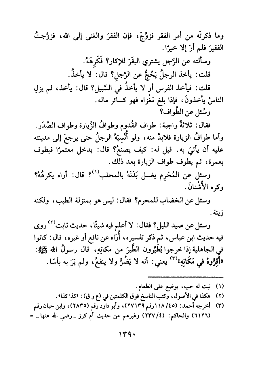 وسئل عن صيد الليل؟ فقال: لا أعلم فيه شيئًا، حديث ثابت (¬٢) روى فيه حديث ابن عباس، ثم ذكر تفسيره، أُرَاه عن نافع أو غيره، قال: كانوا في الجاهلية إذا خرجوا يُطَيَّرون الطَّيرَ من مكانِهِ، قال رسولُ الله - صلى الله عليه وسلم -: "أَقِرِّوهُ في مَكَانِهِ" (¬٣) يعني: أنه يَضُرُّ ولا ينفعُ، ولم يَرَ به بأسًا.