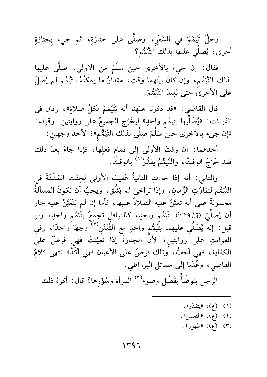 والثاني: أنه إذا جاءتِ الثانيةُ عَقِيبَ الأولى لِحِقَت المَشَقَّة في التَّيَمُّم لتفاوُت الزَّمانِ، وإذا تراخىَ لم يَشُقّ، ويجبُ أن تكون المسألةُ محمولةً على أنه تعيَّنَ عليه الصلاةُ عليها، فأما إن لم يَتَعَيَّنْ عليه جاز أن يُصلِّيَ بتَيَمُّمٍ واحدٍ، كالنوافلِ تجمعُ بتَيَمُّم واحدٍ، ولو قيل: إنه يُصَلِّي عليهما بتَيمُّمٍ واحدٍ مع التَّعَيُّنِ (¬٢) وجهًا واحدًا، وفي الفوائتِ على روايتينِ؛ لأن الجنازةَ إذا تعيَّنتْ فهي فرضٌ على الكفاية، فهي أخفُّ، وتلك فرضٌ على الأعياد فهي آكَدُ" انتهى كلامُ القاضي، وعُدْنا إلى مسائل البرزاطي.