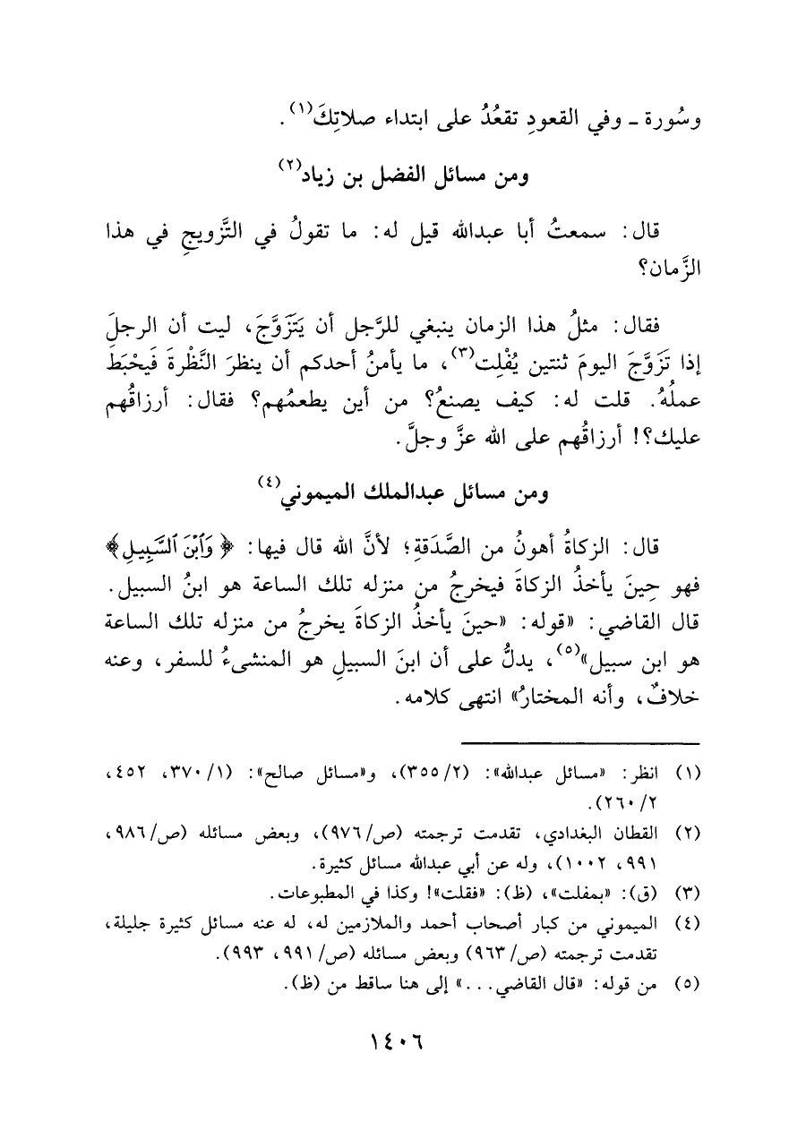 (¬٤) الميموني من كبار أصحاب أحمد والملازمين له، له عنه مسائل كثيرة جليلة، تقدمت ترجمته (ص / ٩٦٣) وبعض مسائله (ص / ٩٩١، ٩٩٣).