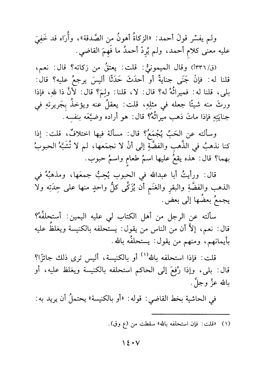 وقال الميمونيُّ: قلت: يعتقُ من زكاته؟ قال: نعم، قلنا له: فإنْ جَنَى جنايةً أو أحدَثَ حَدَثًا أليسَ يرجعُ عليه؟ قال: بلى، قلنا له: فميراثُهُ له؟ قال: لا، قلنا: ولِمَ؟ قال: لأنَّ ذا للهِ، فإذا ورثَ منه شيئًا جعله في مثلِهِ، قلت: يعقلُ عنه ويؤخذُ بِجَريرتهِ في جنايَتِهِ فإذا ماتَ ذهب ميراثُهُ؟ قال: هو أراده وضيَّعَه بنفسِه.