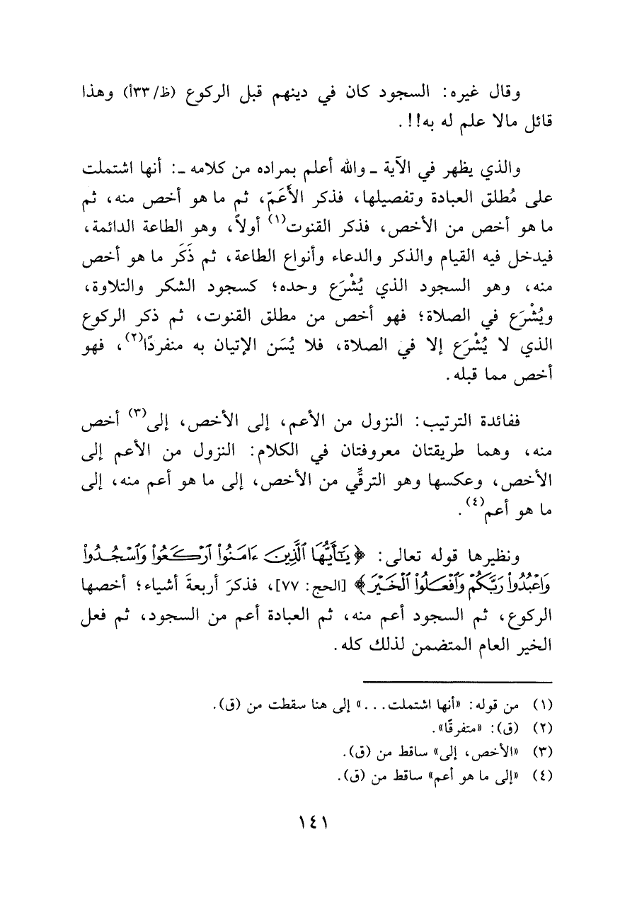 والذي يظهر في الآية -والله أعلم بمراده من كلامه-: أنها اشتملت على مُطلق العبادة وتفصيلها، فذكر الأَعَمّ، ثمَّ ما هو أخص منه، ثم ما هو أخص من الأخص، فذكر القنوت (¬١) أولاً، وهو الطاعة الدائمة، فيدخل فيه القيام والذكر والدعاء وأنواع الطاعة، ثمَّ ذَكَر ما هو أخص منه، وهو السجود الذي يُشْرَع وحده؛ كسجود الشكر والتلاوة، ويُشْرَع في الصلاة؛ فهو أخص من مطلق القنوت، ثم ذكر الركوع الذي لا يُشْرَع إلا في الصلاة، فلا يُسَن الإتيان به منفرداً (¬٢)، فهو أخص مما قبله.
