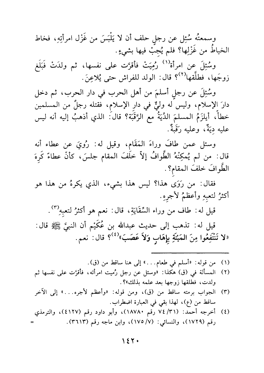 وسمعتُه سُئِل عن رجلٍ حلف أن لا يَلْبَسَ من غَزْل امرأتِهِ، فخاط الخياطُ من غَزْلها؟ فلم يُجِبْ فيها بشيءٍ.