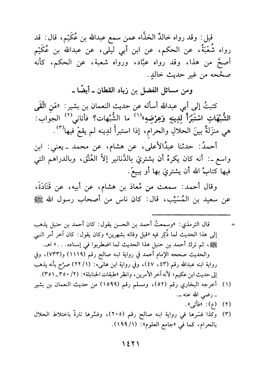 (¬٣) وكذا فسّرها في رواية ابنه صالح رقم (٢٠٥)، وفسَّرها تارةً باختلاط الحلال بالحرام، كما في "جامع العلوم": (١/ ١٩٩).