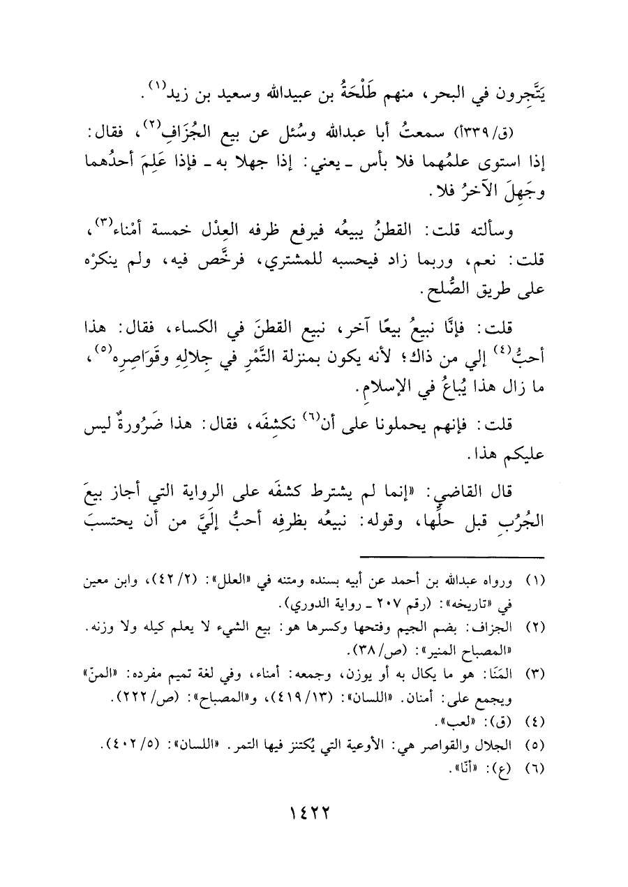 وسألته قلت: القطنُ يبيعُه فيرفع ظرفه العِدْل خمسة أمْناء: (¬٣)، قلت: نعم، وربما زاد فيحسبه للمشتري، فرخَّص فيه، ولم ينكرْه على طريق الصُّلح.