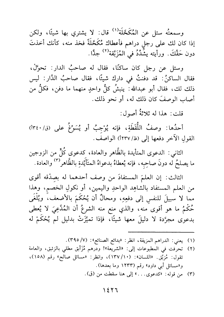 (¬٢) تحرفت في المطبوعات إلى: "الشريعة"! ودرهم مُزَأبق مطلي بالزئبق، والعامة تقول: مُزبَّق. "اللسان": (١٠/ ١٣٧)، وانظر: "مسائل صالح" رقم (١٥٨)، و "مسائل أبي داود"رقم (١٢٣٣ وما بعدها).