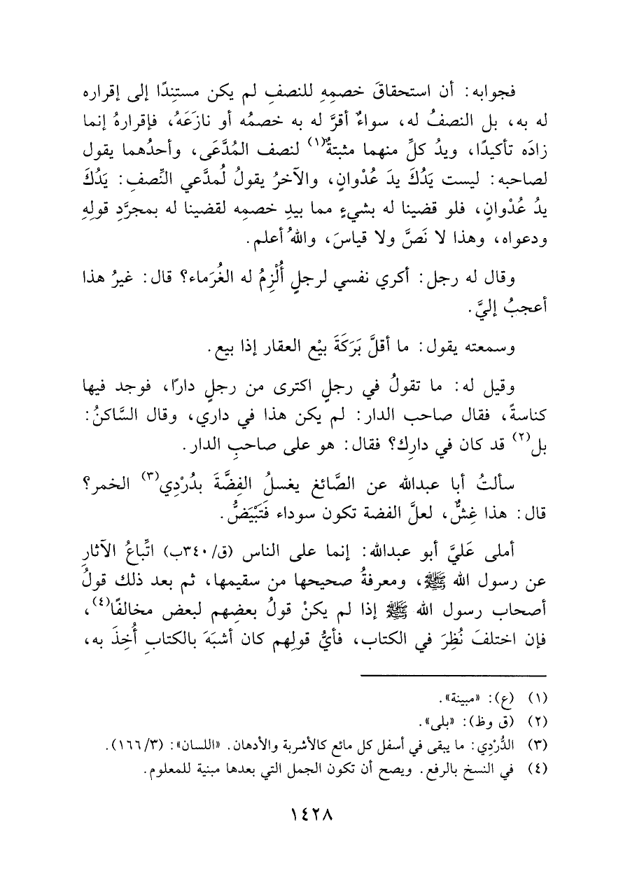 أملى عَليَّ أبو عبد الله: إنما على الناس اتِّباعُ الآثارِ عن رسول الله - صلى الله عليه وسلم -، ومعرفةُ صحيحها من سقيمها، ثم بعد ذلك قولُ أصحاب رسول الله - صلى الله عليه وسلم - إذا لم يكنْ قولُ بعضِهم لبعض مخالفًا (¬٤)، فإن اختلفَ نُظِرَ في الكتاب، فأيُّ قولهم كان أشبَهَ بالكتابِ أُخِذَ به،