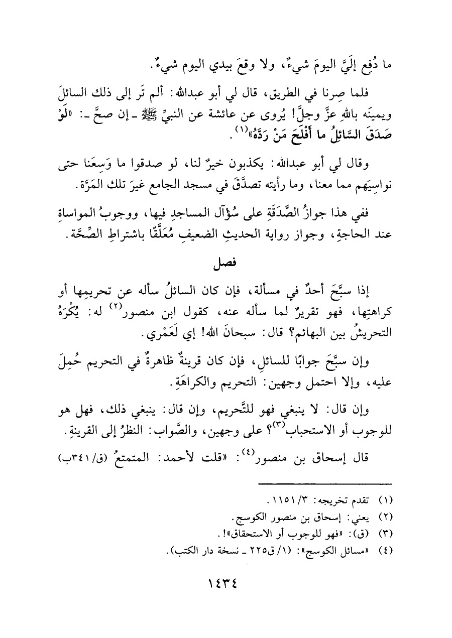 فلما صِرنا في الطريق، قال لي أبو عبد الله: ألم تَر إلى ذلك السائلَ ويمينَه باللهِ عزَّ وجلَّ! يُروى عن عائشة عن النبيِّ - صلى الله عليه وسلم - إن صحَّ-: "لَوْ صَدَق السَّائل ما أفْلَحَ منْ رَدَّهُ" (¬١).