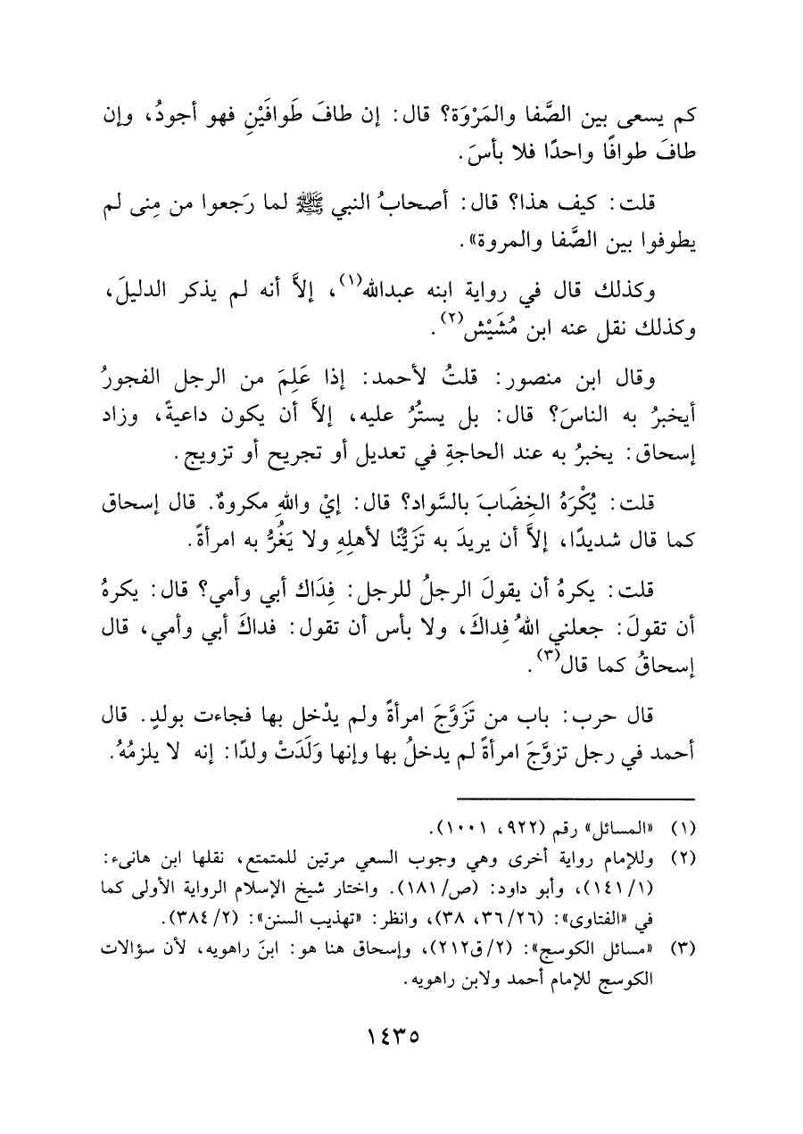 (¬١) "المسائل" رقم (٩٢٢، ١٠٠١).