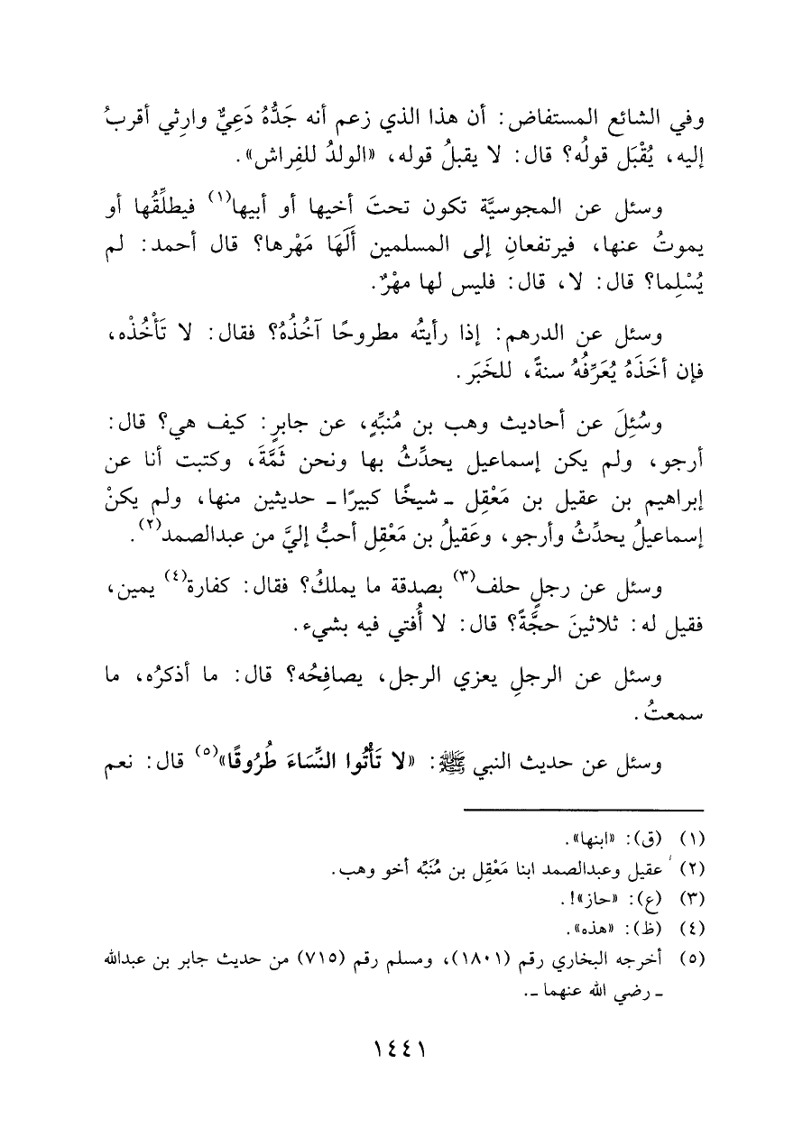 وسئل عن حديث النبي - صلى الله عليه وسلم -: "لا تَأتوا النِّساءَ طُرُوقًا" (¬٥) قال: نعم