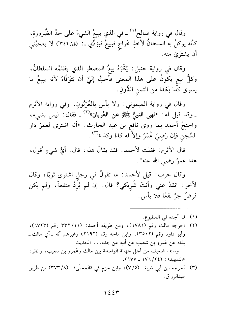 وقال في رواية حنبل: يُكْرَهُ بيعُ المضطر الذي يظلمه السلطانُ، وكلُّ بيع يكونُ على هذا المعنى فأحب إليَّ أن يَتَوَقَّاهُ لأنه يبيعُ ما يسوى كذا بكذا من الثمنِ الدُّونِ.