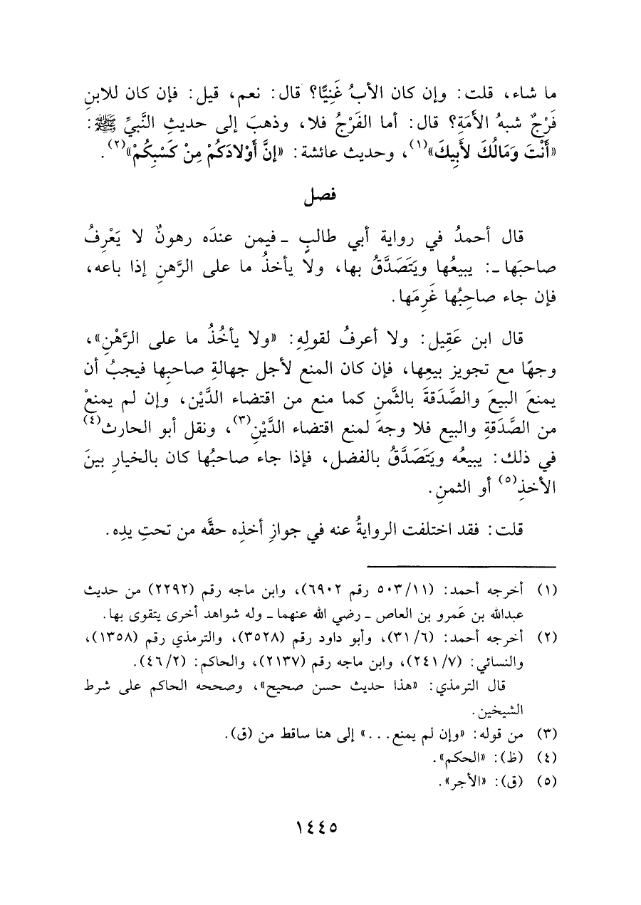 قال ابن عَقِيل: ولا أعرفُ لقولهِ: "ولا يأخُذُ ما على الرَّهْنِ"، وجهًا مع تجويز بيعِها، فإن كان المنع لأجل جهالةِ صاحبِها فيجبُ أن يمنعَ البيعَ والصَّدَقةَ بالثمنِ كما منع من اقتضاء الدَّيْن، وإن لم يمنعْ من الصَّدَقةِ والبيع فلا وجهَ لمنع اقتضاء الدَّيْنِ (¬٣)، ونقل أبو الحارث (¬٤) في ذلك: يبيعُه ويَتصَدَّقُ بالفضل، فإذا جاء صاحبُها كان بالخيار بينَ الأخذِ (¬٥) أو الثمنِ.