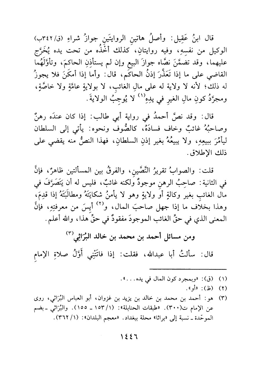 (¬٣) هو: أحمد بن محمد بن خالد بن يزيد بن غزوان، أبو العباس البُرَاثي، روي عن الإمام ت (٣٠٠). "طبقات الحنابلة": (١/ ١٥٣ - ١٥٥). والبُرَاثي -بضم الموحّدة- نسبة إلى "براثا" محلة ببغداد، "معجم البلدان": (١١/ ٣٦٢).