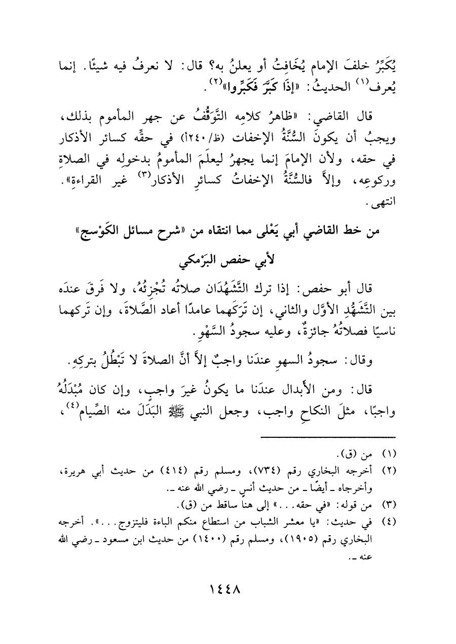 من خط القاضي أبي يَعْلى مما انتقاه من "شرح مسائل الكَوْسج" لأبى حفص البَرْمكي