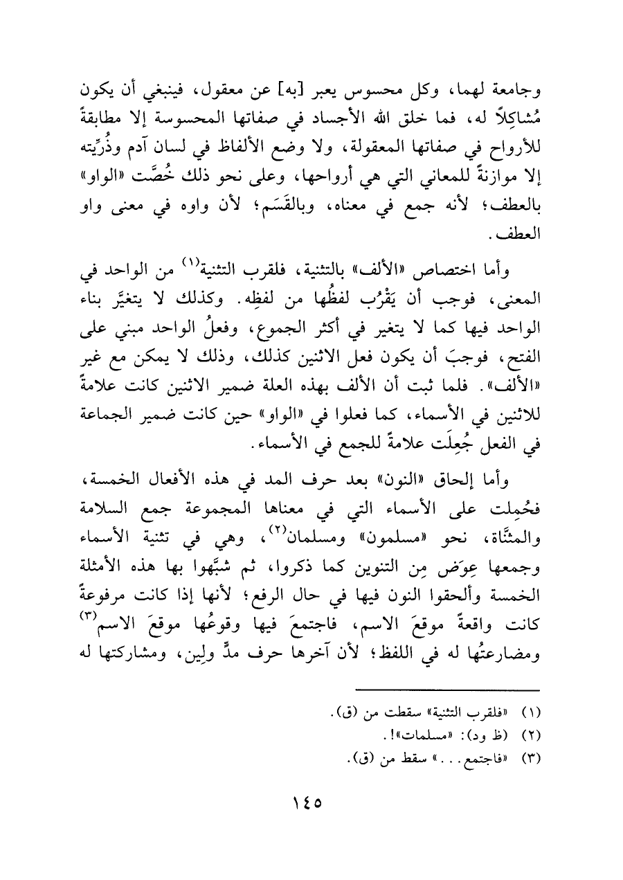 وجامعة لهما، وكل محسوس يعبر [به] عن معقول، فينبغي أن يكون مُشاكِلاً له، فما خلق الله الأجساد في صفاتها المحسوسة إلا مطابقةً للأرواح في صفاتها المعقولة، ولا وضع الألفاظ في لسان آدم وذُرِّيته إلا موازنةً للمعاني التي هي أرواحها، وعلى نحو ذلك خُصَّت "الواو" بالعطف؛ لأنه جمع في معناه، وبالقَسَم؛ لأنَّ واوه في معنى واو العطف.