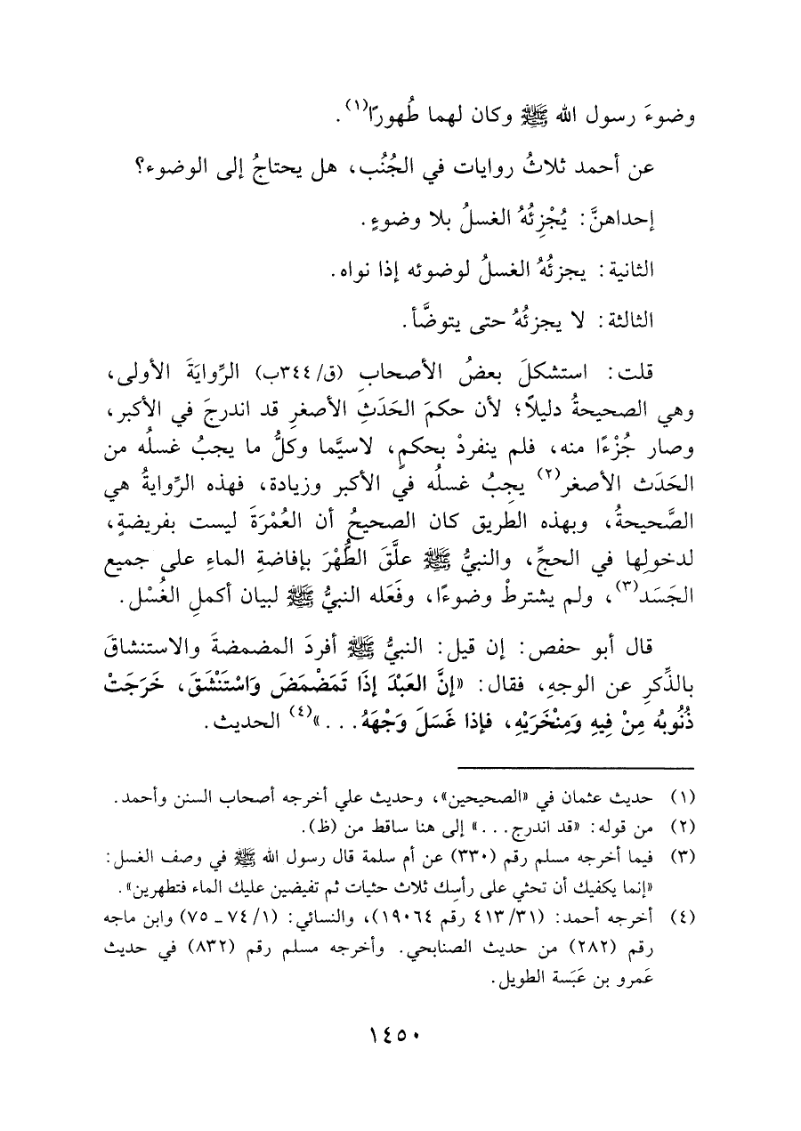 عن أحمد ثلاثُ روايات في الجنب، هل يحتاجُ إلى الوضوء؟